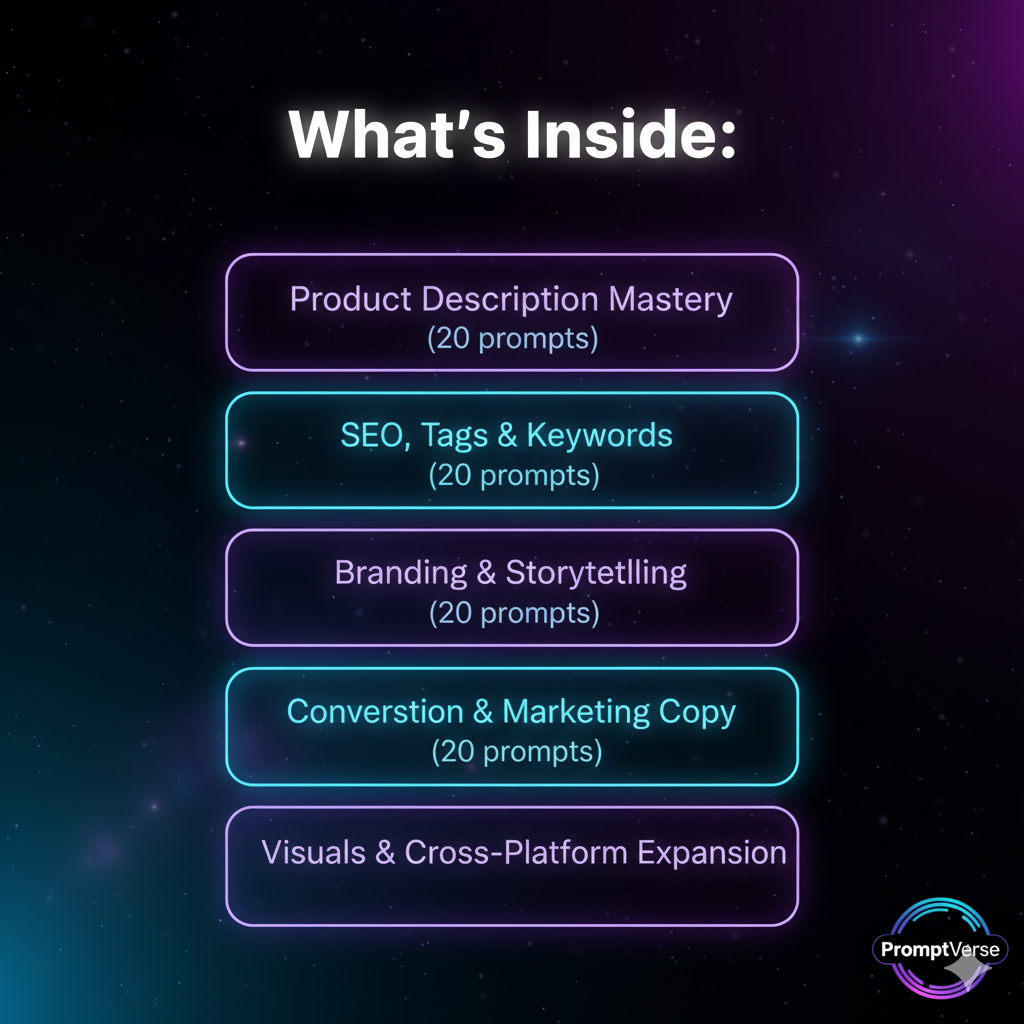 The Product Descriptions / Etsy — ChatGPT Prompt Pack gives you 100 powerful, plug-and-play prompts to write magnetic descriptions, improve SEO, and boost conversions.